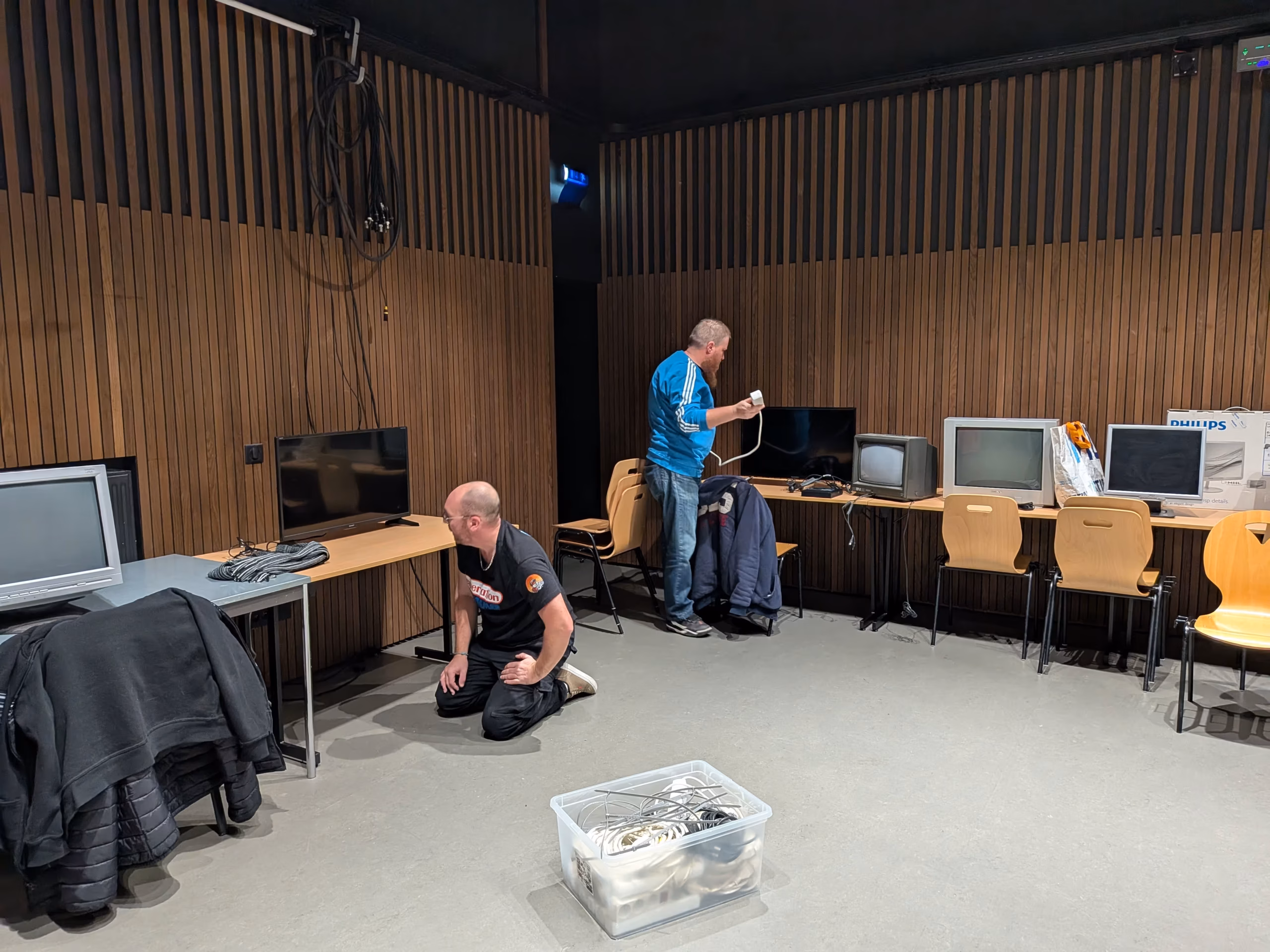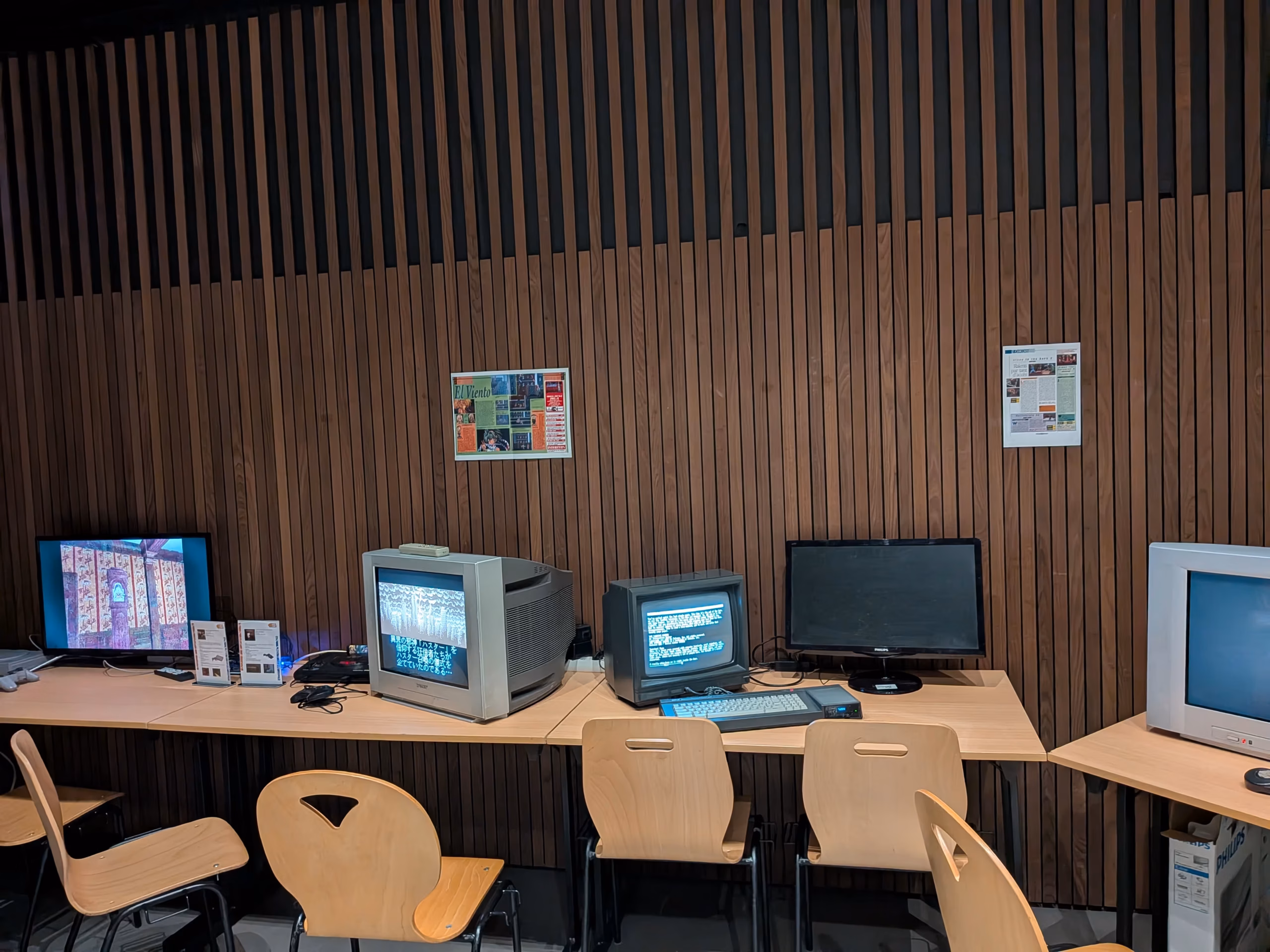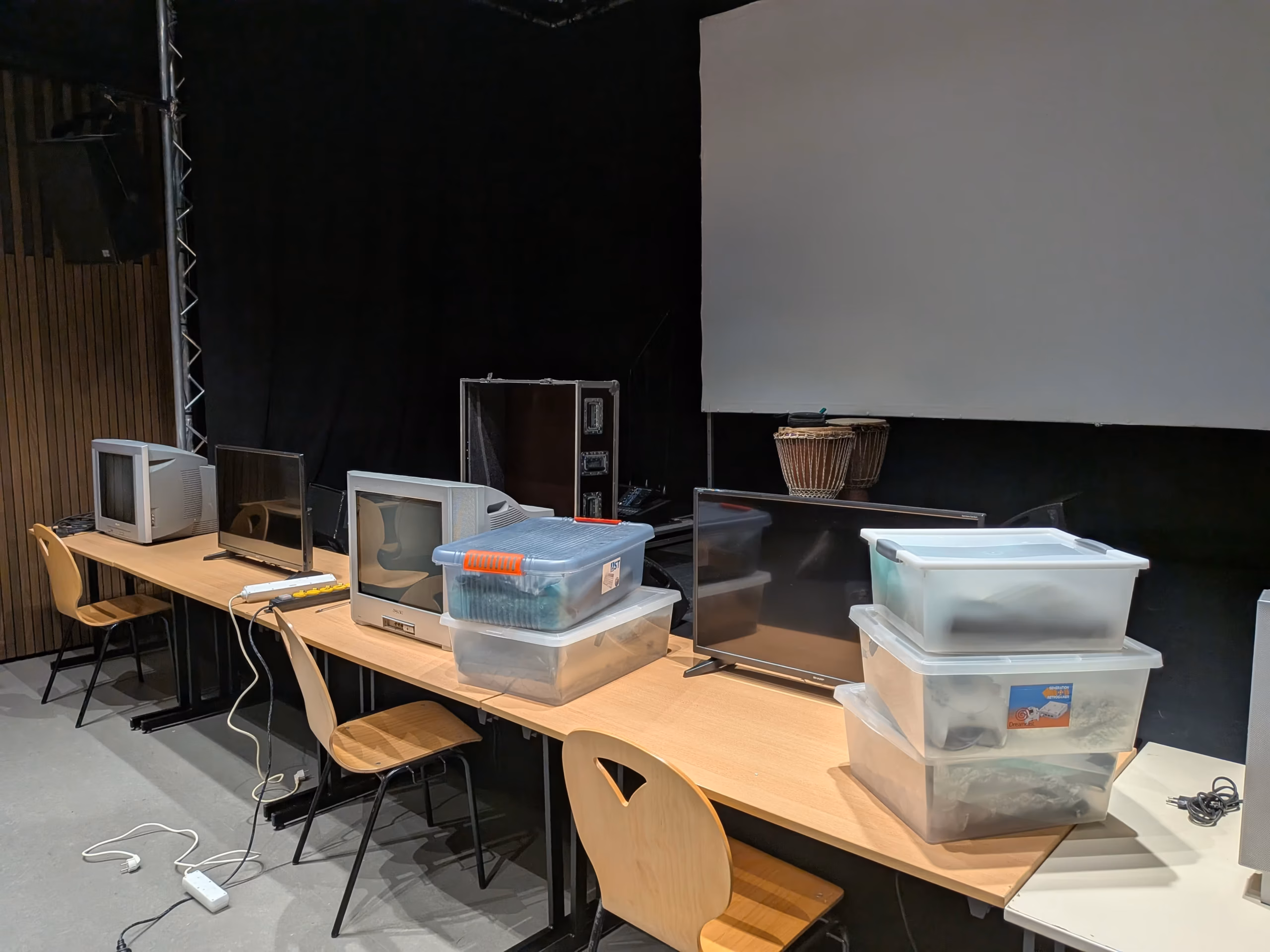 Imaginez une salle où le temps semble suspendu. Des écrans cathodiques qui diffusent une lumière tamisée sur fond de pixels qui s’agitent, dessinant des ombres inquiétantes. Des musiques intrigantes, mais qui nous poussent à nous approcher de la salle…