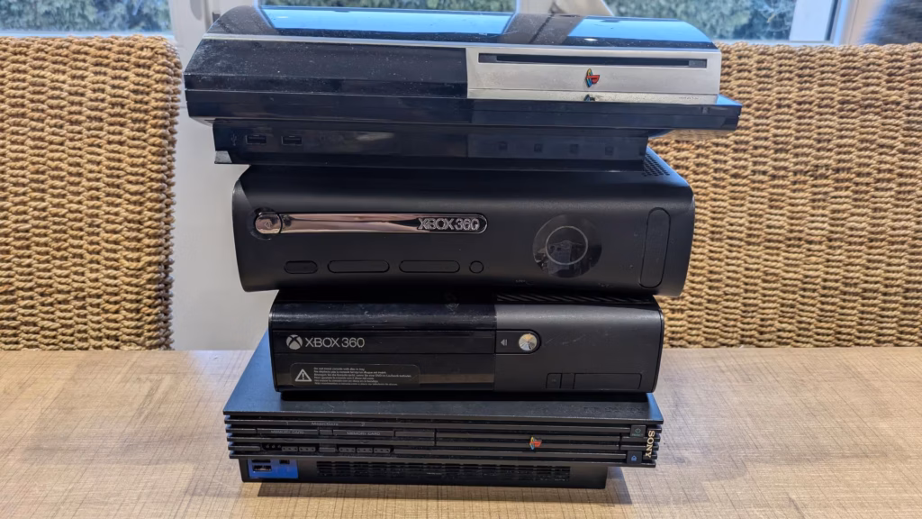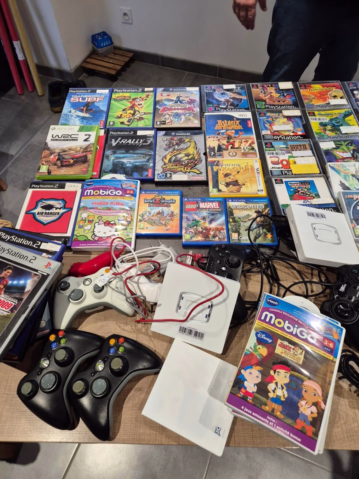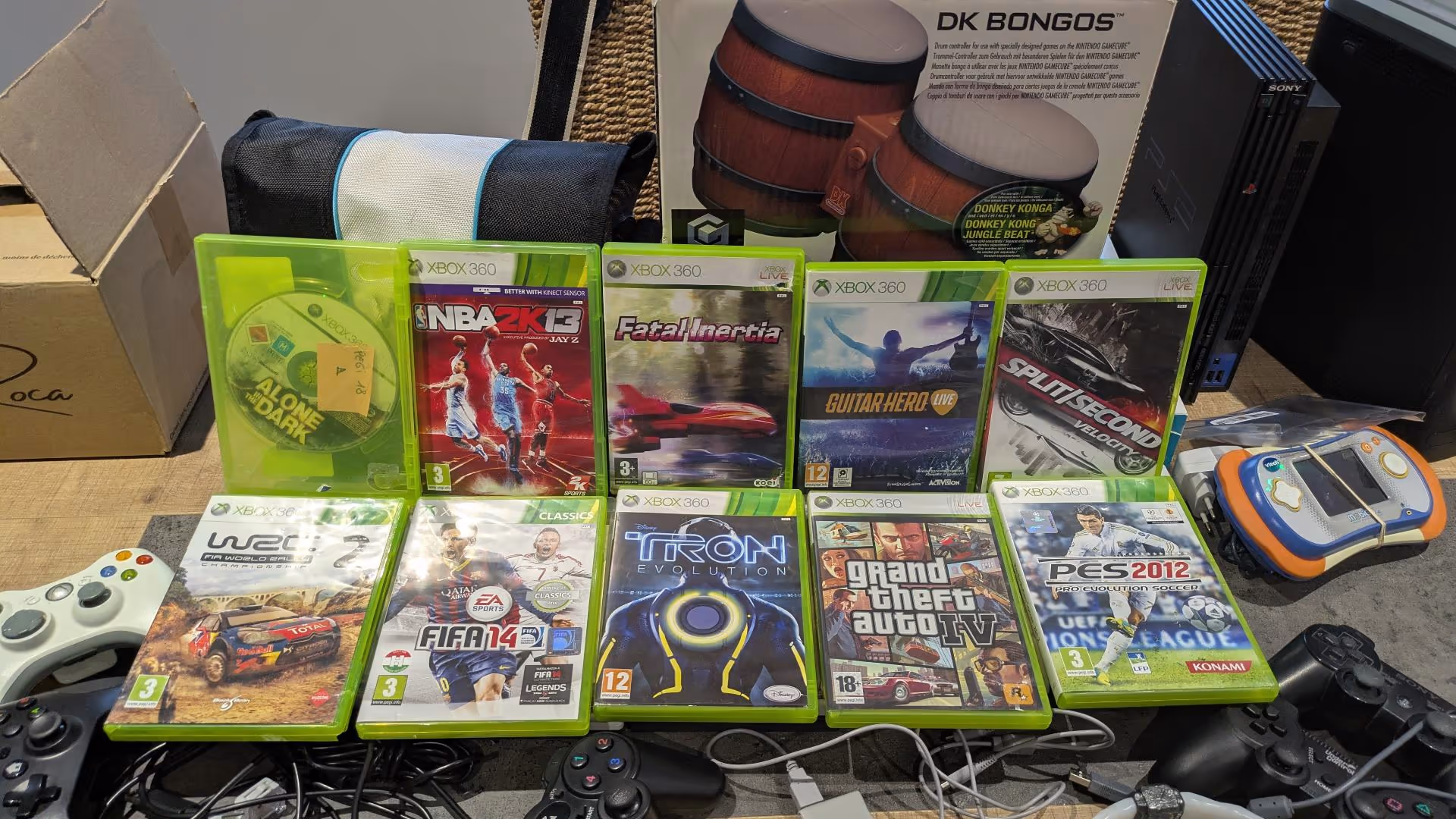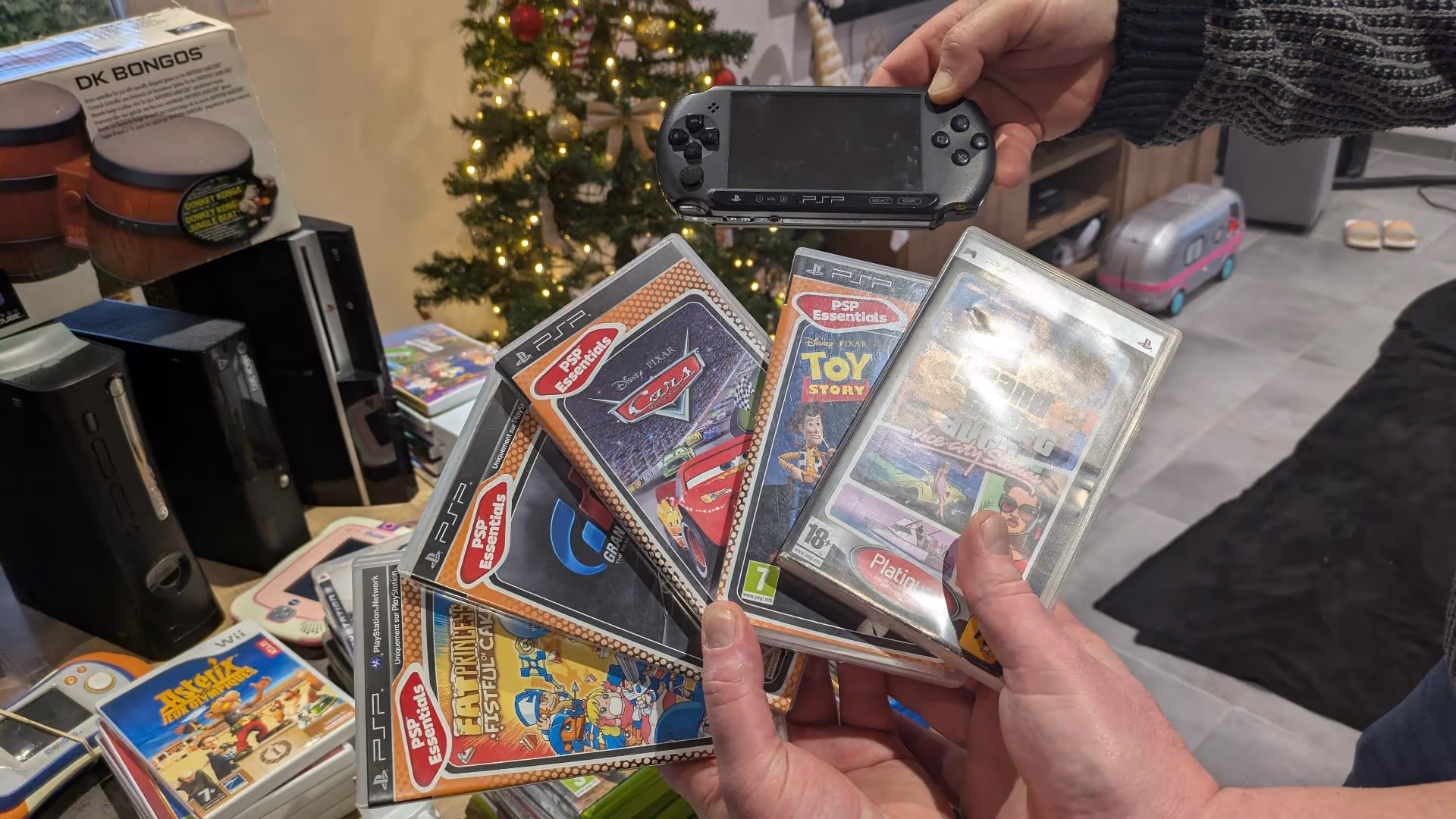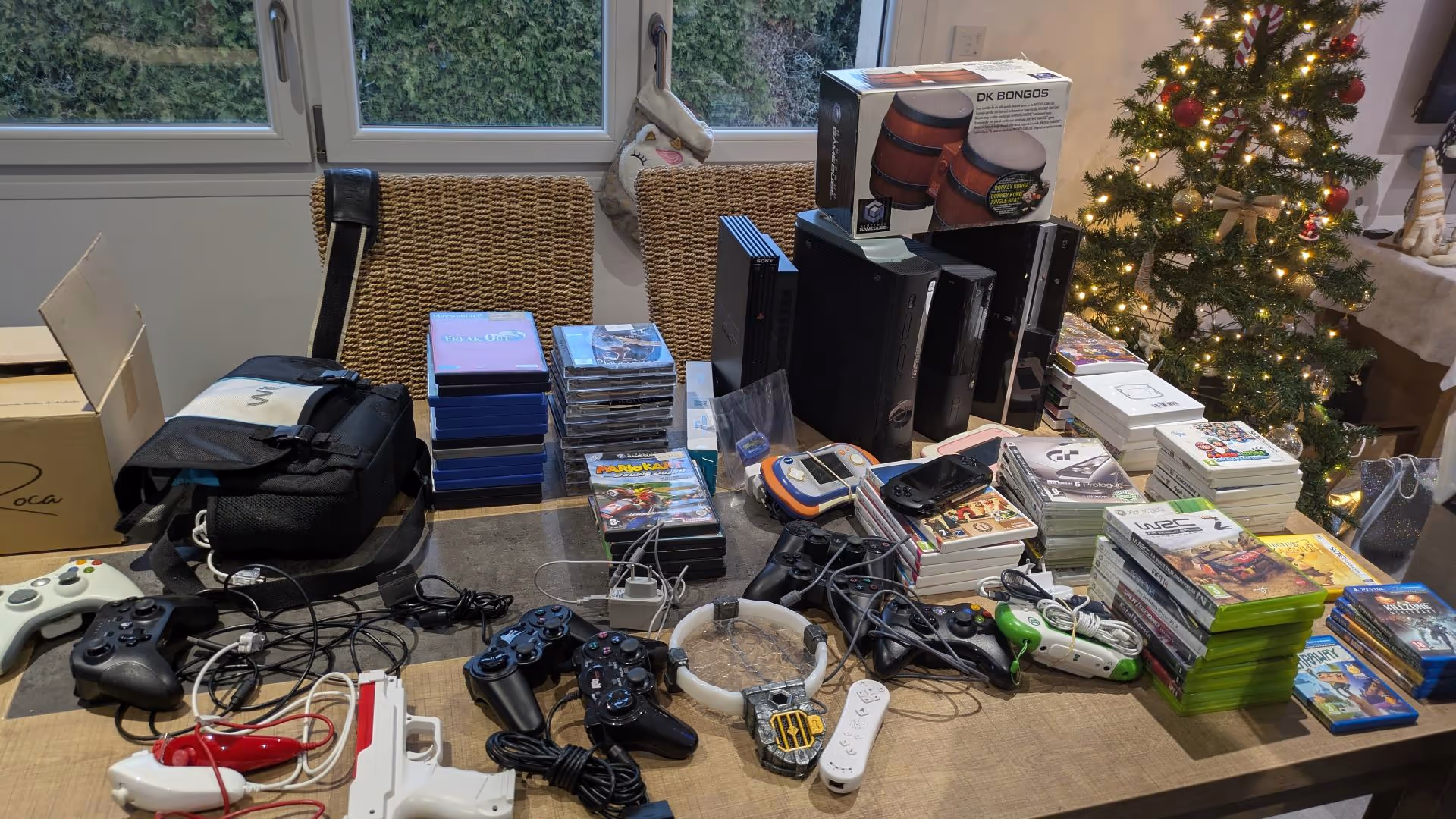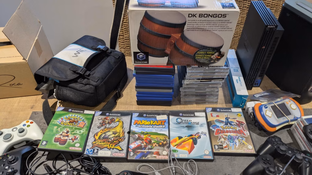 Quand Benji a commencé à ouvrir les caisses, nous avons halluciné… On ne s’attendait pas à ce qu’il y ait autant de matériel ! Nous étions comme des gosses un soir de Noël, les yeux pétillants et curieux de découvrir ce que renfermait chaque boîte… Il y avait des consoles de salon (PS2, PS3, Xbox 360, Wii…), des consoles portables (PSP !!!), des jeux vidéo (beaucoup…), des accessoires divers et variés…