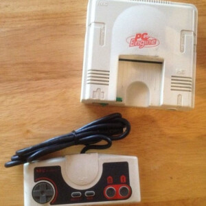 On peut voir ici la taille de la console. Selon moi, NEC avait plusieurs années d’avance lorsqu’il a conçu cette machine. Tout était si miniaturisé. Vous pouvez comparer la taille de la console et celle de la manette. La console n’était pourvue que d’une prise manette. il fallait acheter un quintupleur, par exemple, pour pouvoir jouer à plusieurs. Je suppose que cela avait été fait pour réduire les coûts de production.