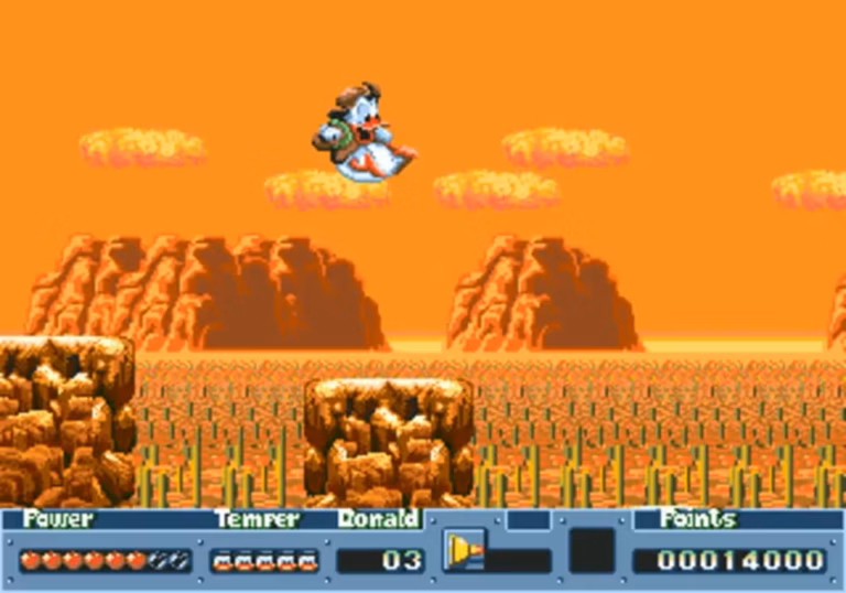 Dans QuackShot, Donald Duck troque son éternel costume de marin pour un chapeau fedora et une tenue d’explorateur, et se lance à la recherche du mythique Talisman d’Isis. Le voyage est un véritable tour du monde : Égypte, Inde, Afrique, Pôle Sud, temples mayas, chaque niveau propose une ambiance visuelle marquée et des décors remplis de pièges, de secrets et de passages à débloquer. Le jeu adopte une structure semi-aventure, presque metroidvania avant l’heure, obligeant le joueur à revenir dans certains niveaux avec de nouveaux outils pour progresser.