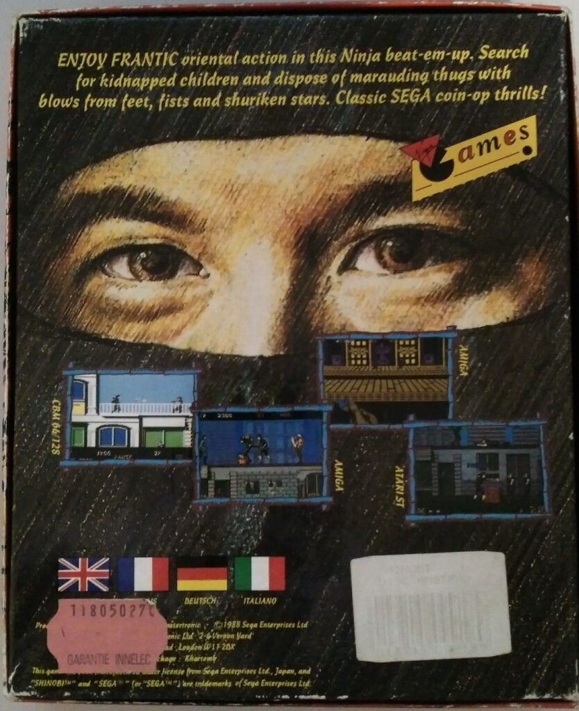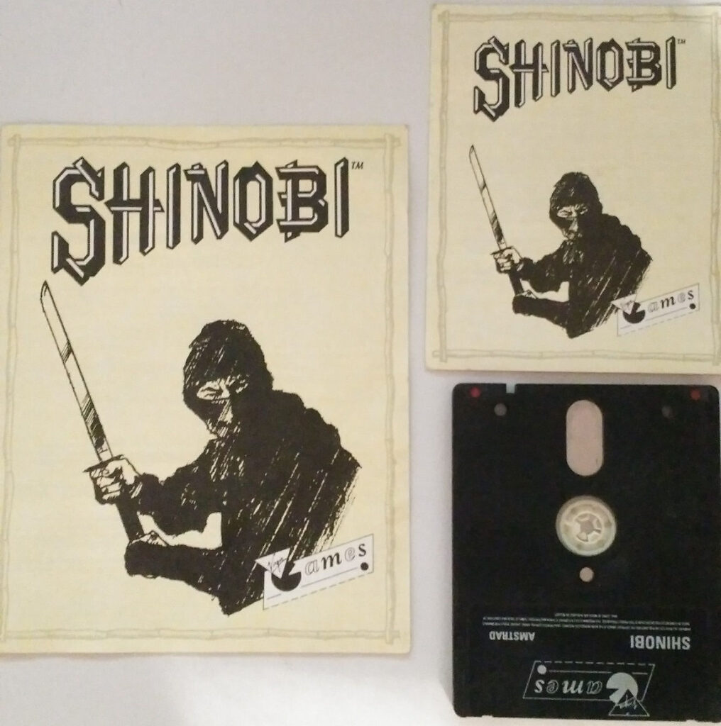 Chez moi, je retrouvais certains de ces jeux d’arcade sur mon CPC 6128. Croyez-moi, même si les graphismes étaient loin des versions arcade, je retrouvais les sensations et l’imagination faisait le reste. On avait l’arcade à la maison ! (enfin c’est ce qu’on se disait…). Ainsi, j’ai passé beaucoup de temps sur des Tiger Road, Black Tiger, Rygar… mais il y avait un jeu que je désirais par-dessus tout, c’était Shinobi. J’en ai longtemps rêvé, et plus d’un an plus tard, Virgin Mastertronic l’a fait. C’était un soir, en septembre 1989 (je me souviens, c’était la période où ma mère ramassait des noix chez moi, je détestais ça). En passant à la librairie, en descendant des marches au milieu du magasin, derrière une vitrine il y avait les jeux Amstrad, et là j’aperçus le Graal ! Deux exemplaires de Shinobi. Il me le fallait. Merci maman, car en rentrant, j’ai pu négocier le jeu contre le ramassage de plusieurs dizaines de kg de noix : le jeu coûtait 149 Francs, je m’en souviens encore.